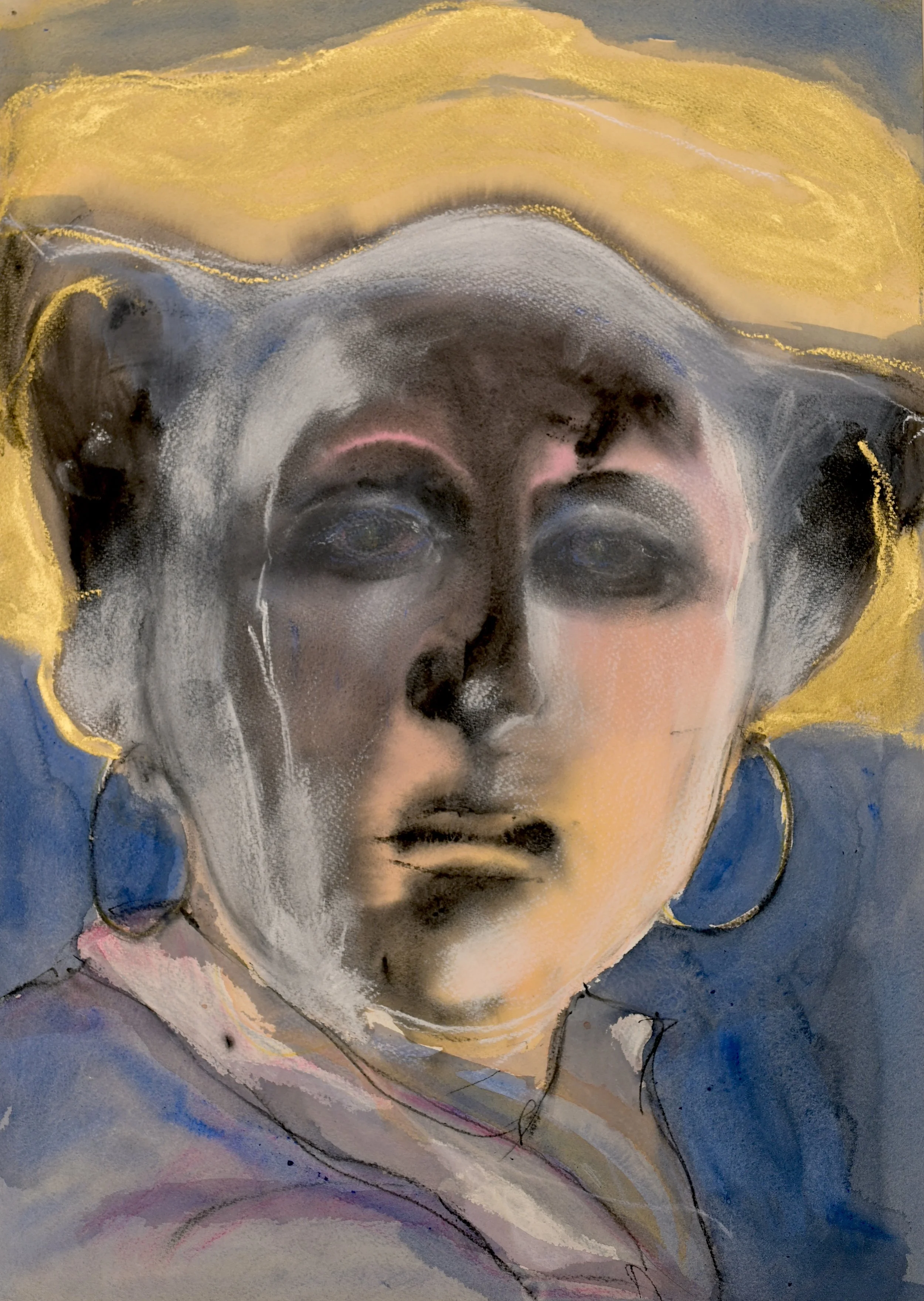 Portret met gouden hoed / acryl, softpastel en oliepastel op papier / 70 cm x 53 cm